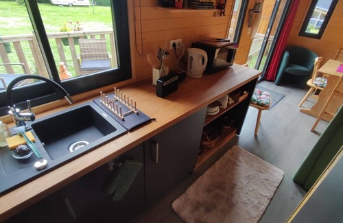 Charming tiny house with enclosed terrace on the owners' 3000 m² land where there is an unrented trailer. Living room with kitchen (microwave, refrigerator, 2 coffee makers, kettle, toaster). Mezzanine beds (access by ladder): on one side 1 double bed, on the other 1 single bed. Beds made (sheets provided), towels and cleaning included. Shower room (hair dryer) with dry toilet. Basic products (oil, vinegar, salt, pepper, coffee, tea). You will be welcomed by Clélia & Hervé and their 2 friendly dogs (Lucien and Michel).