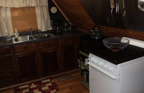 The kitchen comes complete with a full size refrigerator, small stove and microwave as well as all utensils needed to accommodate up to 6. There is also a dining table inside to sit 4 as well as 2 bar stools and a bar for a few extras. Don't cook the bacon to hot or you will set off the smoke alarm (HA!). Camp style food is all you need here, but, be sure and bring your groceries when you come.