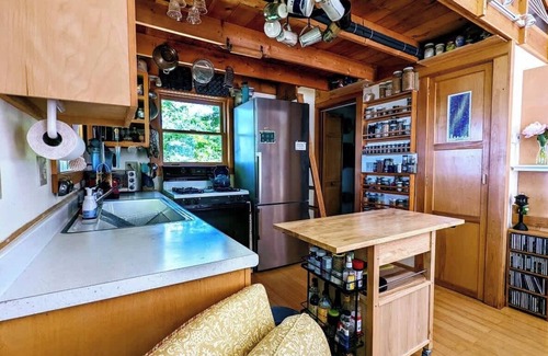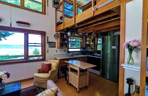 The Tiny Trenton Beach House has an open living/dining/kitchen area. Two large picture windows look out onto the water. The kitchen is fully equipped for your family and guests! There is ample counter space, plenty of pots and pans, kitchen gadget and dinnerware. Cook inside, or use the grill on the deck with a water view and an ocean breeze. .