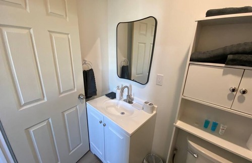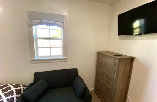 This welcoming retreat features a marvelous living room with a cozy full bed, perfect for unwinding after a day of work. Guests can enjoy modern amenities like AC/heating, WiFi, and laundry area. We hope you'll enjoy your stay at this tinyhouse.