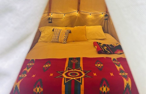 We offer a unique experience of staying in a Tipi for the ultimate in glamping. For your convenience There is air/heat in the Tipi. 3 gallons of spring water from a local spring, cooler with ice, snacks, assortments of coffees, teas, 1 bottle of wine, bedding, pillows, blankets, tableware, lanterns/ candles, a pot, local maps ,brochures and travel tips, toiletries, towels, soap, shampoo/ conditioner, fire wood, s'mores kit, marshmallow roasters, fire starters, propane gas grill, grill utensils, 2 camping chairs all included. A perfect Birthday/ Anniversary / date night/couples celebration/ happy retreat ect