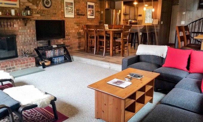 Fully equipped kitchen has butcher block counter tops, breakfast bar, stainless steel refrigerator and range, and back splash. Half bath on main floor. Living room has Roman shades, curtains and couch. Deck has grill, patio dining set, Adirondack chairs and tables. Ceiling fans in living room and upstairs bedrooms. Modern master bedroom furnishings. Both blinds and curtains in living room & upstairs bedrooms. Newly renovated upstairs bath. Office alcove workstation with office chair, monitor, keyboard, mouse & adapter cables. Professional eco-friendly cleaning crew follows Airbnb's highest cleaning standards. Lots of cozy areas for families and friends to unwind after shopping, dining and recreating. Après ski in front of a roaring wood fire. Relax on the Adirondack chairs. Cuddle up with a movie on the comfy couches. Stretch out on the sheepskin pillow chairs. Enjoy sunny, scenic mountain views and magnificent sunsets from the deck. Rustic charm and modern touches make this a home away from home. Starbucks French roast K-Cup pods for Keurig machine, or BYO. Plush, soft linens, blankets and towels await you. Leave your toiletries at home and help yourself to luxurious shampoo and conditioner, refreshing soap, and botanical lotion. 1 queen, 2 twins, full bath upstairs. 4 twins, 1 queen sleeper sofa, full bath, laundry room downstairs. Main level kitchen, dining area, sunken living room, 1/2 bath. TVs and Blu-ray DVD players in living room and den. TV and DVD player in master bedroom. Dining table seats 6. Breakfast bar seats 3. Game bar seats 2. Exterior Ring camera doorbell by front door is on for your security.