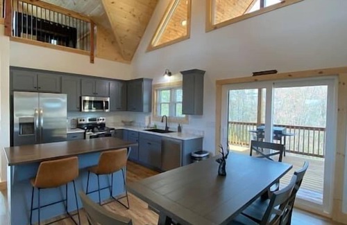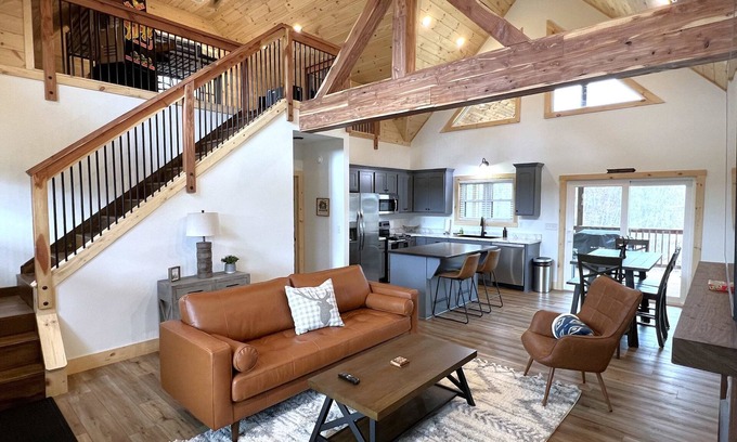 Location, location, location! Centrally located in the heart of the Gorge! This newly built cabin is your perfect modern getaway to explore all the Red River Gorge has to offer. This cabin boasts an open spacious layout with soaring wood wrapped high ceilings, beautiful exposed cedar beams, two private bedrooms both with ensuite bathrooms, plus a 3rd loft bedroom with 2 full size beds. Guests will also enjoy a fully stocked kitchen, Smart TVs in every room, Stone wrapped gas fireplace, covered back deck with a hot tub and a Blackstone grill, and a large backyard firepit area.