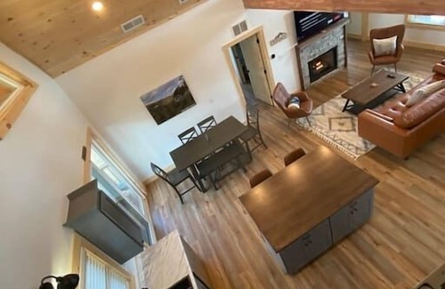 Upon entering guests will be greeted by a spacious open floor plan featuring the living room, kitchen, and dining area. The living room features high ceilings wrapped with pine wood, exposed cedar beams and a 65-inch smart TV along with a stone gas fireplace activated with a flip of a switch