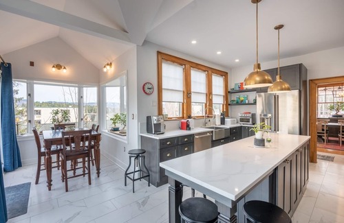 Kitchen: 6 burner gas stove and oven, Refrigerator, Dishwasher, Microwave, Ice Maker, Drip Coffee Maker, Teapot, Blender, Hand Mixer, Island with 4 Bar Stools, TV, Table with 4 Chairs, Access to Deck