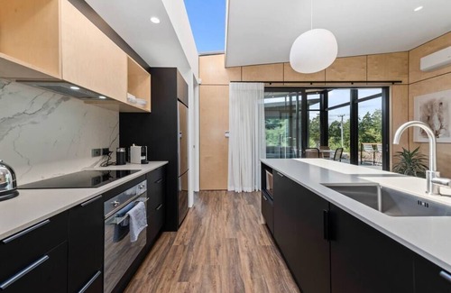 The space is a newly built 2 bedroom 2 bathroom home Named Ngahere (meaning bush forest) home sits beautifully nestled into the developing native and parallel to the tall established oak trees on the property. Enjoy a restful night's sleep in comfy new Queen sized beds. Make use of the full kitchen, washer/dryer, heat pump/Aircon, gas fire and TV. Always professionally cleaned.