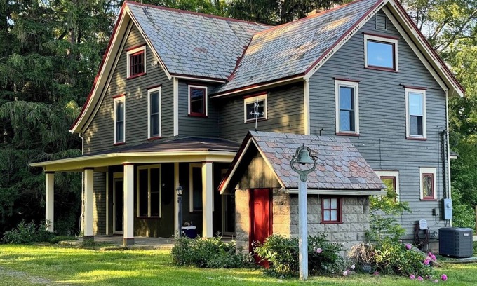 Quiet you can hear. Lush trees, birdsong, and a chorus of bullfrogs. The gentle sound of the fountain at Tom’s Farm. Built in 1908, this farm has been in the same family since 1947. The home is both historic and chic. Walnut panelled dining room from trees on the property. Winding oak staircase. Outside- two porches for your coffee or evening beverage, a grill and a firepit.