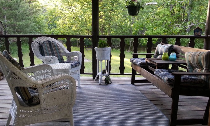 With 2 comfortable bedrooms, each with a queen size bed, loft with a queen and twin sized bed and a full-sized hide-a-bed it can easily sleep 7 to 9 guests. The kitchen is equipped for full meals and more. Amenities include coffee maker, microwave, full-sized fridge and toaster. A full sized dining table can seat everyone. There is a sitting area just off the dining room for reading and visiting with family and friends. The living room is adjacent with seating for 5. Off the living room enjoy a beautiful covered deck overlooking the river. This cozy one-bath home has a first floor shower/bath combo and a nearby full laundry. Linens, towels and paper products are provided for our guests. A game closet, Wi-fi, and full-sized TV with basic cable are also provided.