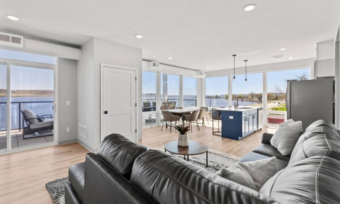 Welcome to our charming Vacation Rental nestled in the picturesque town of Lake City, Minnesota, offering breathtaking views overlooking the tranquil waters of Lake Pepin. As you step inside, you'll be greeted by a cozy and inviting atmosphere, with large windows allowing natural light to flood the space and showcasing stunning vistas of the shimmering lake. The interior is tastefully decorated with a blend of modern amenities and charm, providing the perfect retreat for your getaway. The accommodation features a spacious living area where you can unwind and relax after a day of exploration. Curl up on the comfortable sectional sofa next to your fireplace with a good book and enjoy the sunset views. Adjacent to the living area is a fully equipped kitchen, complete with everything you need to whip up delicious meals during your stay. Enjoy the convenience of preparing your favorite dishes while taking in sweeping views of the serene surroundings. This 2 bedroom 2 bath unit offers a king bed in the master bedroom with attached bathroom and a queen bed in the guest room, both made with plush all organic bedding. Wake up to the breathtaking sunrise and step out onto the private balcony to savor your morning coffee. Outside, you'll find a spacious and private balcony where you can dine alfresco or simply soak up the sunshine on the outdoor couch while admiring the panoramic vistas. Fire up one of our barbeque grills out front or on the rooftop for a cookout with friends and family, or take a leisurely stroll down to the lakefront to enjoy activities such as fishing, boating, or simply lounging on the shore. This third floor unit offers some of the best views in the entire building and comes with an assigned garage on the lower level. Conveniently located near downtown Lake City, our vacation rental provides easy access to a variety of shops, restaurants, and attractions. Whether you're seeking outdoor adventure, cultural experiences, or simply a peaceful retreat away from the hustle and bustle of city life, our Lake City Vacation Rental overlooking Lake Pepin offers the perfect blend of comfort, convenience, and natural beauty for your next getaway.