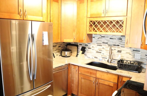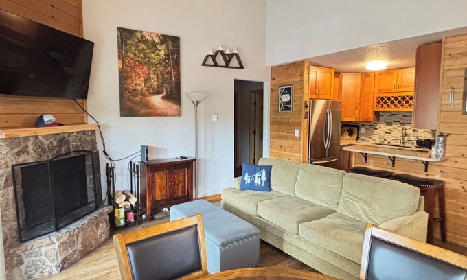 Newly remodeled top floor 2 bedroom with two levels, vaulted ceilings, and amazing views of the resort! Updated and fully equipped kitchen with granite countertops, new cabinets and stainless appliances. Real wood burning fireplace! Entrance to condo is into an outside covered stairwell so no shared inside hallways or elevator. Easy access from surface parking lot right out front but yes there are two flights of stairs:) King bed in the downstairs bedroom; Queen futon and Full/Twin bunk bed upstairs. Upstairs is completely private, not a loft and has it's own full bath and tons of space. Large closets in both bedrooms and entrance hallway. Private balcony off of the main floor with a bistro set to enjoy the view. Wifi and new Samsung smart TV's in living room and both bedrooms. Side by side washer dryer on the main floor with separate laundry room. The Pines is centrally located between the resort and downtown Steamboat, walking to grocery stores, liquor stores and several restaurants. The main free bus route stops right out front of the complex every 10 min for easy access to the resort or downtown.