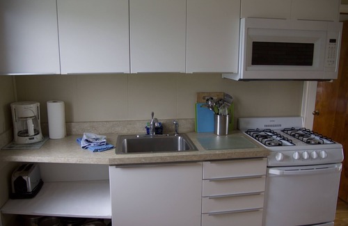 * Fully equipped kitchen with cookware, coffee maker, toaster, microwave, and extras like wine openers and measuring cups