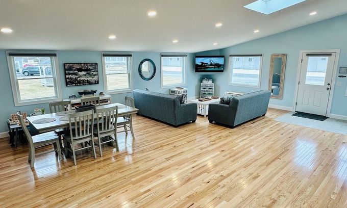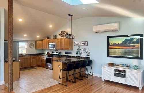 Brand new, modern home located just across the street from our private, groomed beach and with partial views of Cape Cod Bay and gorgeous sunsets! Home has 2 bedrooms, with 2 queen beds in each bedroom (sleeping up to 8 people total), 2 bathrooms (1 with tub/shower, 1 with shower) and a private back deck with seating for meals and a stairway that leads right towards the indoor pool complex with hot tub, sauna, steam room, weight room, basketball, tennis, ping pong, corn hole and more! The home has every amenity you could desire, central A/C, washer and dryer, dishwasher, granite kitchen counter tops, flat screen tv's, wood floors, custom tile bathrooms and entry way, carpeted bedrooms, free wi-fi, daily housekeeping, and more! Everything is brand new and with a perfectly appropriate nautical and beach theme! Come enjoy all that our New Anchor House and Resort has to offer!