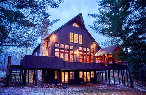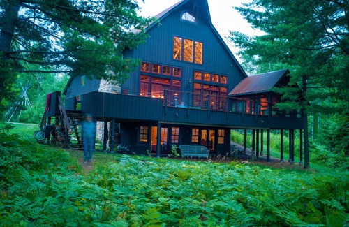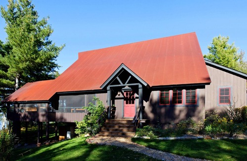 Our home is located on over 900' of private lakeshore (18 acres) surrounded by beautiful white pine, maple and birch forest. The 3000 square foot home was built in 2003 from a 200 year old Vermont hay barn we had disassembled, transported and painstakingly reassembled into a luxury vacation home. The hand hewn beams inside are up to 20' in diameter and the walls are original barn board.