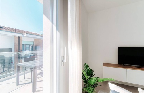 Upon entering, you will be greeted by a modern environment, where a comfortable sofa invites you to relax in front of a large TV, where you can watch films in company after a day of sightseeing. In the same space is a round dining table for four. An additional piece of furniture provides storage space. The kitchen, white with a wooden worktop, is fully equipped with everything you need to prepare lunches and dinners. A painting depicting Torno, one of the picturesque villages on Lake Como, adds a touch of originality and invites you to visit: from the centre of Como you can reach Torno by boat in just 15 minutes! The living room overlooks the balcony furnished with table and chairs, perfect for enjoying moments of relaxation in the open air.