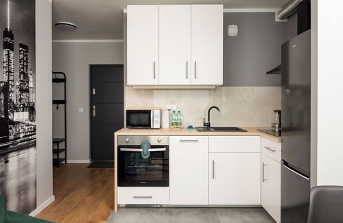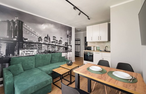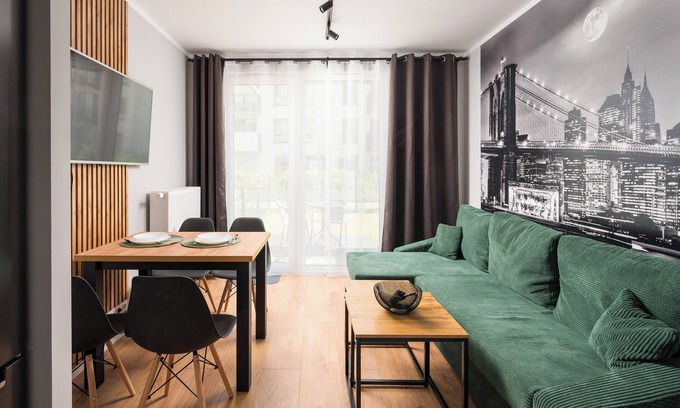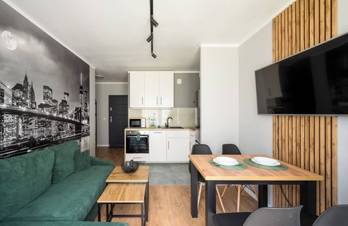 Toruńska Vita Apartment #A is a modernly furnished apartment that features a living room with a sofa bed and kitchenette, a bedroom with a comfortable king-size bed and a desk for studying or remote work, a bathroom, and a garden where guests can relax and enjoy their morning coffee or an evening glass of wine. Guests have access to a range of practical amenities, including free WiFi, a television, an iron, a washing machine, a hairdryer, a dishwasher, a fridge with a freezer, an oven, a microwave, and kitchen accessories. There is also a parking space in the underground garage available to guests.