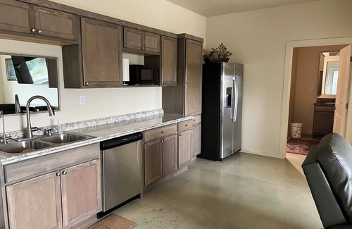 Sitting on property with hundreds of cottonwoods and natural wetlands, this desert retreat was built this year for one or two occupants. Close to Black River Village and south of Carlsbad, this rental is a perfect spot for a traveling nurse, 1 or 2 explorers, an oil-field manager or anyone who thrives in open spaces but enjoys high-end lodgings. This apartment attached to a large shop features 1 bedroom with a super-comfortable queen bed and large closet; an 8'x8' bathroom with a 4x4 shower; a large couch and a lazy boy in the living room with a big screen TV, and WiFi (multiple channels included) Cook a steak or sit and enjoy a sunset on the 20'x 20' covered patio (Pit Boss BBQ, table and chairs provided) OR cook indoors using an air fryer, crock pot and/or electric skillet. The kitchen includes a full size refrigerator with ice-maker and a dishwasher. Need parking for a large trailer? No problem. There is space behind the unit to park it for no additional fee. Your car or truck is protected under a covered car port. This unit offers all the comforts of home while visitors enjoy uninterrupted views of Guadalupe Peak, fishing in a private pond or hunting arrow heads on over 100 acres of riparian wet lands. Want to know where to go hiking or to explore other outdoor areas? We are happy to assist. We will also give you total privacy if that is what you desire.