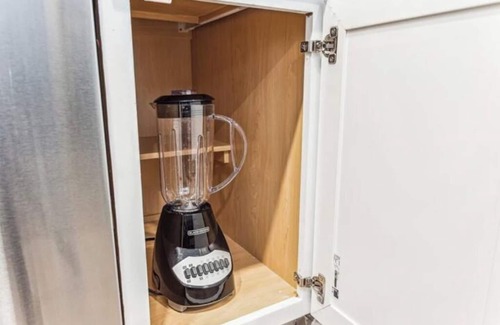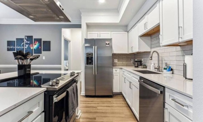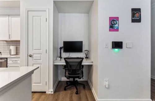 The spacious chef’s kitchen, fully stocked with all the essentials, invites you to prepare your favorite meals with ease. The serene bedroom features a queen memory foam bed with luxurious bedding for a restful night's sleep, and king-sized pillows for added comfort and luxury. A dedicated workspace with a 27" external monitor, ergonomic chair, and secure high-speed internet ensures you can stay productive during your stay.