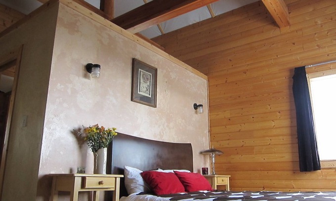 The master bedroom is on the top floor of Towrehouse with an open vaulted view of the pyramid ceiling. Exposed wooden beams highlight this 400 sq ft floor. The house if perfect for a couple. If you have 1-2 extra guests there is an inflatable queen mattress or high-quality foam mattress that can be placed in the living room.
