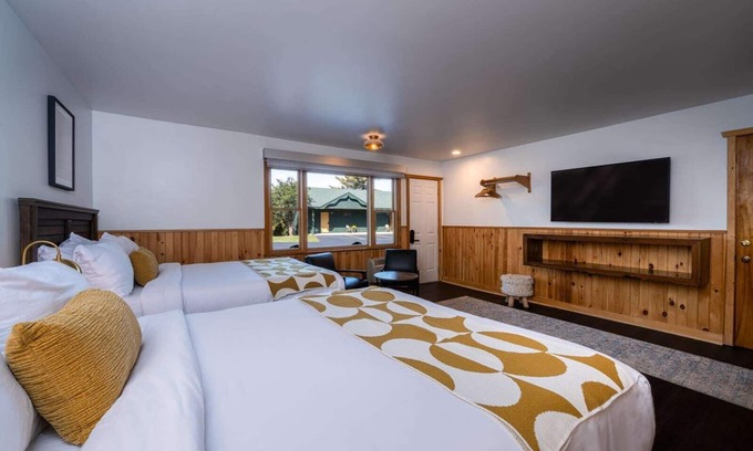 Deluxe Two Queen rooms are larger and more spacious than Superior Two Queen rooms and feature a seating area, luxury bedding, a mini-fridge, Keurig coffee maker, and flat-screen web-enabled TV with complimentary access to Disney+, Hulu, and ESPN+. Bathroom styles vary, with a number of rooms providing walk-in showers and others providing a shower/tub combination. Select Two Queen rooms are pet friendly.