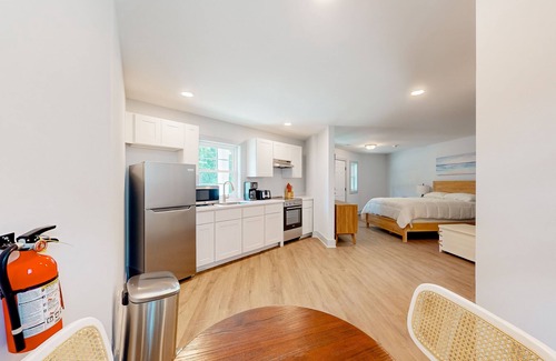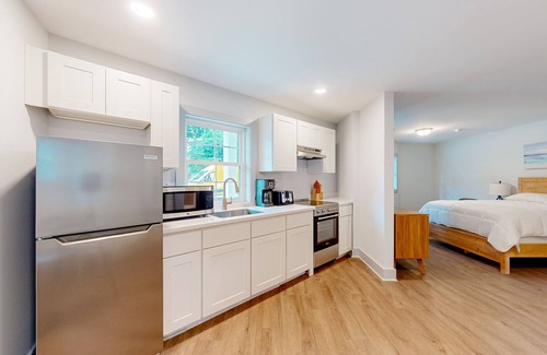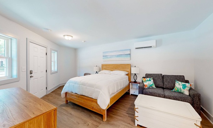 This air-conditioned retreat boasts a studio-like floor plan with a well-equipped kitchen with all the essentials, a smart TV with streaming services in front of the bed, a cozy seating area with a sofa bed, and a full bathroom with a washer/dryer for your laundry needs.
