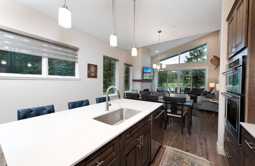 Stay at our new 4 bedroom/3.5 bath townhome and enjoy spectacular views of Engineer Mountain and Twilight Lake. Perfect for multiple families, the home has 2 living spaces (on different floors) each with its own gas fireplace and 65” TV, 2 Master Suites (one up and one down, each having its own TV/private bathroom), indoor/outdoor dining areas on both floors (lower outdoor dining area is covered), upgraded full kitchen, open floor plan and a covered hot tub that seats 6. There is a deck off the main living space with an outdoor dining table as well as additional seating and another outdoor living space off the ground floor living space with a private hot tub, gas fire pit and another outdoor dining table - both have awesome views.