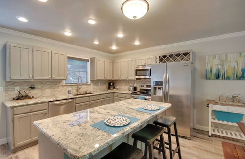 KITCHEN: Stainless steel appliances, drip coffee maker, dishware & flatware, cooking basics, dishwasher, ice maker, toaster, island w/ seating