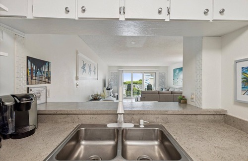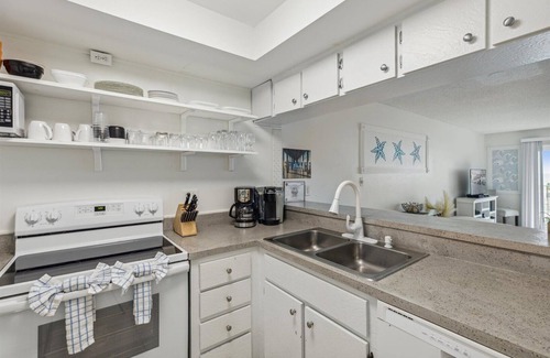The 1st floor features a half bath and fully stocked and supplied kitchen, that looks into the living room with comfortable seating and a large flatscreen Smart TV. The living room opens to your balcony for ocean views.