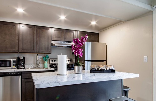 The townhome is ideally suited for small families with children, couples, business travelers or solo travelers and can comfortably accommodate up to 5 guests. Inside the property, you will find a glamorous open concept living space with plenty of windows illuminating the space and gorgeous modern decorations designed to make you feel right at home. Just past the living room, you will find the kitchen, containing ample space for anyone who wishes to dine in and fire up their culinary skills. There is plenty of overhead and lower cabinet space filled with all the amenities you need to cook a wholesome meal – including cookware, silverware, glasses, plates, and pots & pans. Also, start your day off with a warm cup of perfectly brewed tea/coffee using our complementary coffee machine.