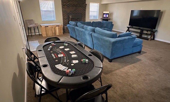 ACCOMMODATIONS: After a day of adrenaline-pumping rides, retreat to the comfort of your accommodations. Our property can sleep 13 individuals (if using the couches) and has ample space to add air mattresses if needed. The rental features 4 well-appointed bedrooms, 3 full baths, a kitchen fully-equipped with gas stove, refrigerator, microwave and coffee maker, a quaint sitting area with 65" TV, and a spacious entertainment area with 75" TV, poker/blackjack table, large sectional, computer area and several cozy fireplaces providing the perfect blend of rustic charm and modern convenience for all ages. Unwind on either the upper or lower decks, cook out on the grill, gather around the fire pit for cozy evenings spent reminiscing about the day's adventures.