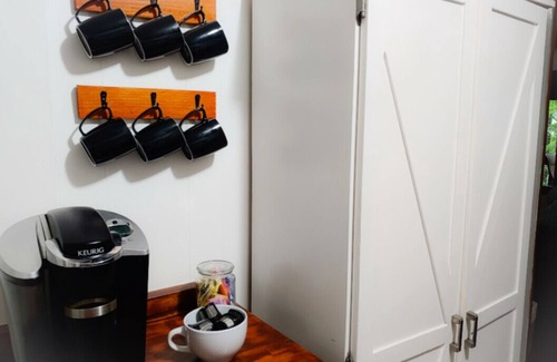Trailseeker Cabin touts a fresh contemporary design and adventurist aesthetic. There is a fully equipped galley kitchen with ALL your meal prep needs in mind including convenient essentials such as oils, spices, coffee, sugars, and other staples are provided as well.