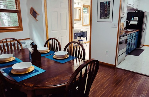 Gather around the dining room table with seating for 6. Enjoy board games, cards, or relax with a jigsaw puzzle. Feel free to use the provided cooler or baby high-chair for your convenience.