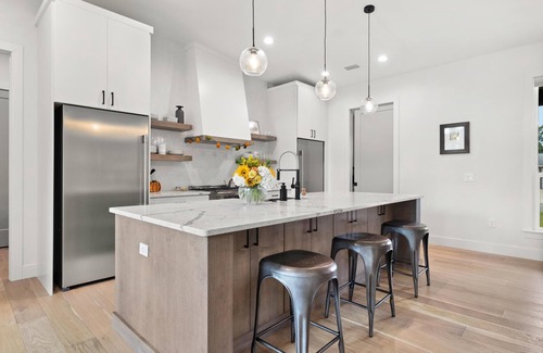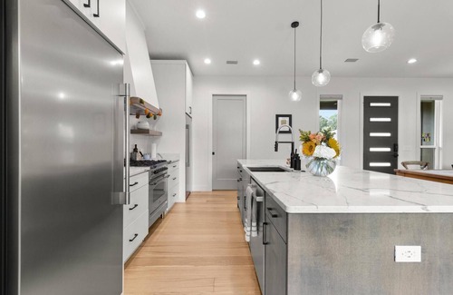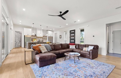 This gorgeous home is a new construction located in the quiet, central neighborhood of Suburban Heights. Approximately 2 miles from UF, this home is on a peaceful street and has a trampoline and grill for tons of outdoor fun! The home has a split floorplan, with a master bedroom with a king bed and double shower on one end, and two bedrooms with queen beds on the other. Between those bedrooms is a small gaming area with another TV. In the house's center is a gorgeous kitchen and dining space.