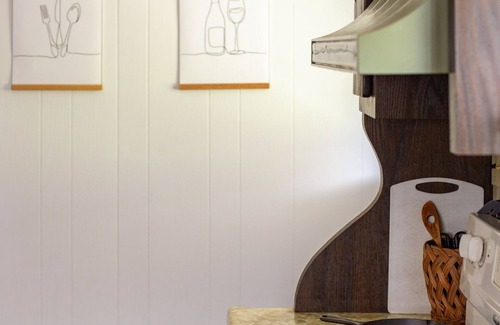 The retro kitchen is fully equipped with all the essentials for preparing meals at home. You’ll find a stove and oven, large refrigerator, microwave, coffee maker, French press, dishwasher, and full set of cookware. Whether you’re whipping up a quick breakfast before hitting the trail or enjoying a slow dinner after a day outside, this kitchen has you covered.