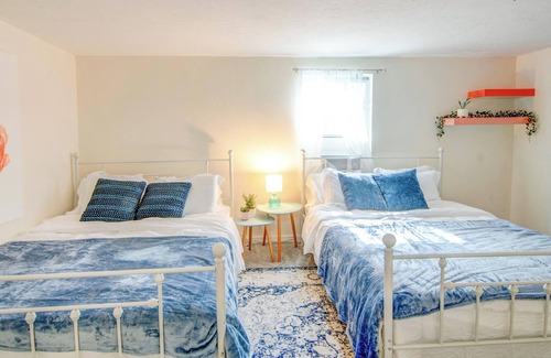 There are four bedrooms and two full bathrooms and a fully kitchen stocked with all the essentials! Our favorite spot is the unique book wall where you can cuddle up and enjoy your favorite novel. Hotel grade linens, towels, and bathroom amenities are conveniently provided to make your trip hassle free. There is a large private backyard where you can play games and host outdoor meals under the trees.