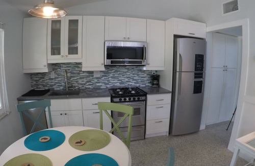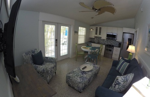 Just 300 steps from the beach, Harbor Lane Court is a 4 unit resort, with 3 one bedroom, one bath apartments, & one two-bedroom, 2 bath apartment. Look at our photos to see a site plan with all 4 units and their ID numbers & read their reviews. Renovated in 2016, all units are ground floor & this little resort has lots of Old Florida charm, with the original 1962 terrazzo floors and cathedral ceilings. Apartment #3 (Sanctuary) is one bedroom one bath & sleeps 4 adults comfortably with our queen size Bellagio Hotel mattress and a full-size sleeper sofa in the living room. All units are full apartments & feature new stainless steel appliances: full-size refrigerator with ice maker, natural gas range/oven, microwave, and dishwasher.