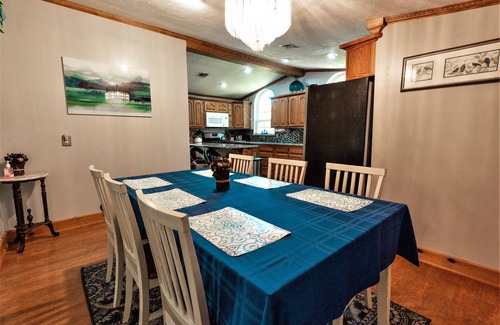 This Spacious 3100 sq ft home is a quiet getaway in the foothills of the Ozark Mountains. It is nestled on two acres with a lake view and is a mere 1200 feet from the Pettit Bay Marina and Park entrances and 10 miles from the Zeb Wildlife Management Area. The large yard can accomodate campers and boats or pitch your own tent. The gazebo has provided for many picturesque moments and the fire pit with andirondack chairs provide for great evening entertainment. There are various seating throughout the yards with a picnic table and cusioned swings. A few long banquet tables can be requested for serving outdoor meals. Guests have access to covered parking for 2 vehicles.