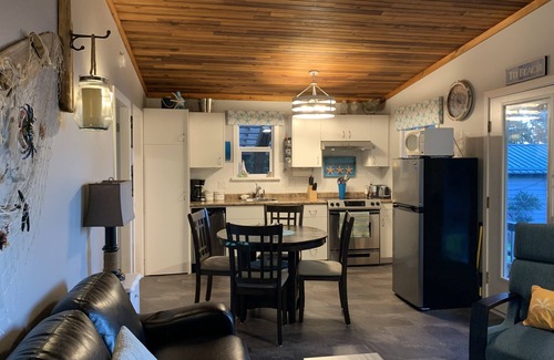 This 2 bedroom cabin is completely renovated and decorated tastefully with ocean reflections . Modern kitchen has apartment size dishwasher, fridge and full size stove , and well equipped amenities. There is a kitchen table with leaf and 4 chairs. Living room has a cozy Woodstove. In living room is a sopha, 2 occasional chairs, and footstool. Flat screen TVs in living room and bedroom. Free WiFi. Vaulted Pine Ceilings add warmth and character.