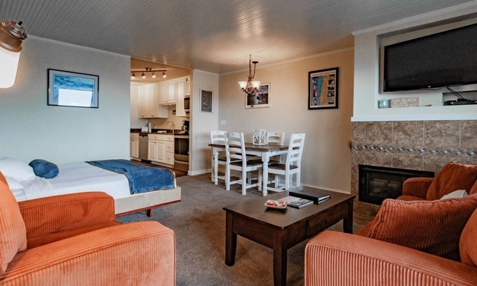 Delight in coastal tranquility with a forest-view studio featuring a queen Murphy bed, private balcony, and full kitchen. Perfect for a romantic or solo retreat, enjoy serene woodland views, private beach access from the property, and scenic trails. Unwind in the heated pool, hot tub, or saunas, and savor the elegance of a secluded Oregon Coast escape enhanced by resort comforts.