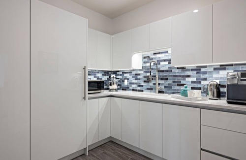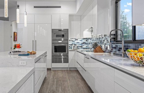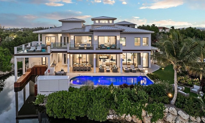 "Babazeka Sun" is a spectacular brand new custom built contemporary four bedroom, four and two 1/2 bath waterfront estate strategically positioned upon the tranquil waterways overlooking the renowned Greg Norman designed Ritz-Carlton Golf Course offering convenient exclusive access to world class Seven Mile Beach and the wonders of the Award Winning Ritz-Carlton, Grand Cayman Resort. Extending those lucky enough to experience it, the very best that the Ritz-Carlton Resort lifestyle has to offer by simultaneously balancing the laid-back island vibe of the Caribbean with a healthy dose of posh. Nestled behind lush foliage and private gates lies a lovely canal side garden and large luxurious waterfront private pool area including a covered outdoor entertainment space that gives way to extraordinary navigable waterway and golf course views. A dramatic large scale pivot door and three story entry with bespoke commissioned art feature wall greets guests upon arrival, leading to a light, bright gourmet chef's kitchen with top tier appliance package, a generous center island with seating for 6, a convenient built in desk workspace, a butler’s pantry with an extensive stock of hostess items that is ideal for both casual poolside get togethers as well as the finest Chef's dinners and an elegant dining area with seating for 8 that is the envy of even the most discriminating gourmand. An expansive grand living space with multiple seating groupings, sunken cozy big screen TV viewing area, a spectacular two story glass elevator with wraparound suspended stair and full length glass sliders afford breezy walk-in/walk-out access to the pool, grill and outdoor living space that lends itself perfectly to sunset cocktail parties and al fresco dining as the ideal integration of both indoor and outdoor casually elegant living. The Villa can very comfortably accommodate as many as 10 guests with 3 spacious King suites and a charming Queen suite with an additional two custom crafted single bunks for the youngest visitors. The second level family room contains a cozy seating area and games table, ideal for family game nights. The Primary King Suite spans virtually the entire rear of the second level of the Villa and provides panoramic golf and water views from the private coffee terrace as well as the ensuite bedroom and bath. A large soaking tub, double vanities with sit down dressing area and massive walk in steam shower rounds out the Primary Luxury Suite experience.