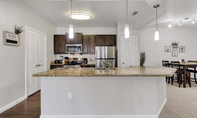 Our spacious and open floor plan features a large kitchen island, perfect for cooking up delicious meals and entertaining guests. With its modern decor and cozy furnishings, you'll feel right at home in our space.