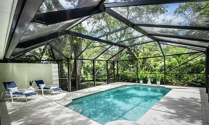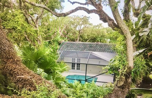 The 3 bedroom, 2.5 bathroom house is beautifully renovated, light-filled, fully and tastefully furnished with plush club chairs and sofas(including a sofa bed),king beds, many built-in closets (including a walk-ins)and a dining table for six. The open-plan wood and granite kitchen beneath a skylight faces french doors leading out to the terrace and screened-in (heated)pool- perfect for whiling away lazy afternoons or enjoying your breakfast and espresso in the morning. The huge master suite has a very large bathroom with double sinks and bidet, as well as a windowed shower enclosure. Second bathroom is windowed as well, with a full-sized bathtub. An elegant guest bathroom is off main hall. All the windows, skylights, and doors are fully storm-proof, and a two car garage is attached. An outdoor shower allows you to go from beach to pool with ease, and a gas grill along with picnic table are perfect for al fresco dining. in addition, canopy storage for any toys you bring to this non-HOA property.