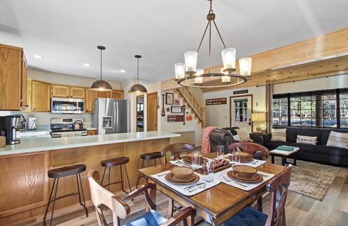 INDOOR LIVING: Smart TVs, dining table, ceiling fans, vaulted ceilings, board games, books, DVD player, wood-burning stove, computer desk and chair (laptop/mouse not included).