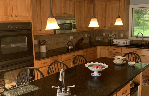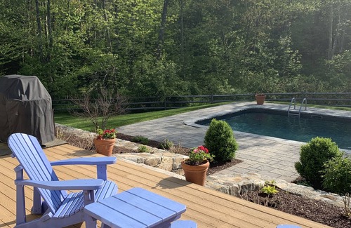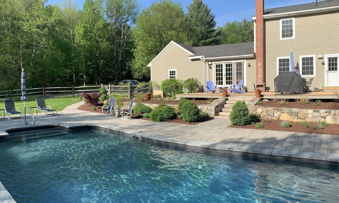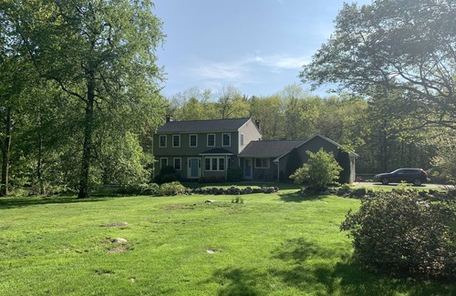 Two acres of private property with lush greenery and heated pool in the heart of horse country. Sleeps up to 6 with 3 BRs and 2.5 bath. Den with TV and large Living Room with TV & stereo system. Large eat in kitchen with separate dining room. Central air conditioned, washer dryer. Backyard has heated pool with patio and deck and comfortable lounge chairs and outdoor eating area. Weber propane BBQ on the deck. Close by to Goshen Fairgrounds, Lime Rock Raceway, Music Mountain, antique shops, numerous hiking trails and lakes. 30 minutes to the Berkshires, 15 minutes to Litchfield, 45 minutes to Tanglewood. 15 minutes to Tyler Lake if bringing boat. Skiing nearby for winter getaway.