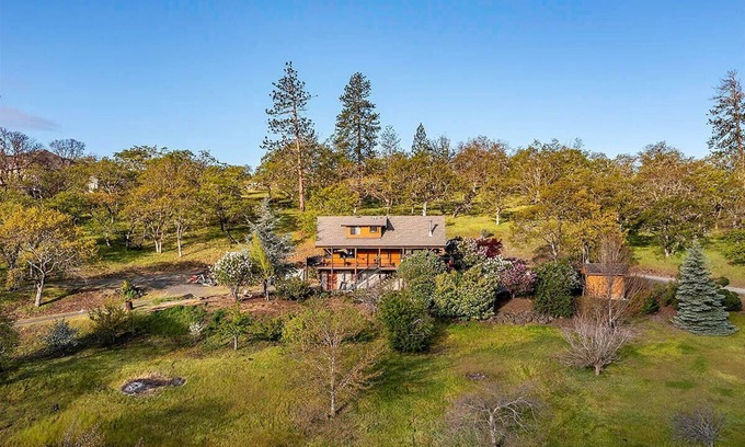 Log cabin home on 80 acre estate at the edge of town. Close to all that Southern Oregon has to offer: Crater Lake, Jacksonville, wine tasting, Ashland, the Rogue River, and more! Once you get here, you may not want to do anything but sit on the porch and enjoy the view of Mount McCloughlin, but there are many other options for things to do during your stay. The cabin itself has 3 bedrooms on three floors. The master bedroom is on the upper floor and has it's own bath with shower. The main floor has a kitchen, a large living room, and a bath with a jacuzzi tub. The lower floor has two bedrooms, a laundry room, a full bath and access to the two-car garage.