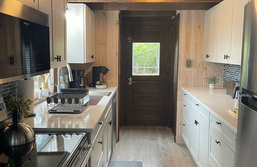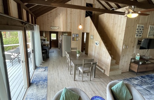 It is delicately appointed with new furnishings. This property provides you with everything you need. The beautiful Granite fireplace is a perfect setting for cooler evenings. On the first floor there is a galley kitchen opening up to the cathedral-beamed dining room/living room open floor plan with floor to ceiling double sliding glass doors to the deck and your beautiful view (*ocean, not lake). There is a heat pump for addlt heating and cooling A/C needs. There is a bedroom on the first level with a queen sized bed, as well as a second bedroom with two twin sized new memory foam-gel infused mattresses. There is also a 1st floor bathroom with a tub and shower combination.
