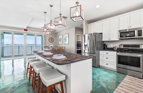 Open concept from living room to kitchen with a beautiful view with sliding glass doors in kitchen, living room, and Master Bedroom to the ocean view water. 86 inch Smart TV, huge leather sectional with recliners on each end! Master bedroom has a king size bed and smart TV. Second bedroom has TV with Queen over Queen size bunk bed. Third bedroom has TV with Queen over Queen size bunk beds. There are board games and outside games for entertainment! Stunning tile throughout. Pet friendly with approval!