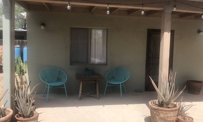 Clean and quiet two-bedroom home with queen-sized beds, one bathroom, and an Arizona sunroom, a guest house in the backyard with a queen-sized bed, an additional bathroom, and a kitchenette.