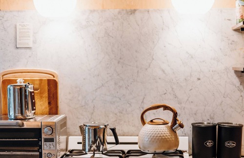 The kitchen has marble countertops and a Kohler sink. There is a fridge, freezer, and gas stove/oven. There is also a Breville countertop oven that is fast, excellent, and easy. Sharp knives and cutting boards, pots and pans, silverware and plates, a French press and kettle, and all the kitchen accoutrement available for use.