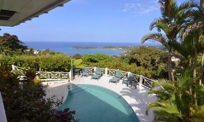 in the patio door...Sit up and look out over a panoramic tropical vista of the Blue Mountains and warm Caribbean Sea...You get out of bed, and sit out on the deck, watching the hummingbirds feeding on the masses of beautiful flowers, and listening to Nature...Your cook brings you a sumptuous breakfast for two, as your partner joins you on the pool.