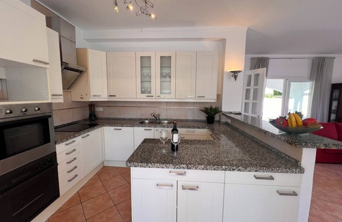 The single-storey villa stands on a 1,000 m² plot and has a built area of 145 m². Upon entering we are greeted by a spacious living room with a fireplace, followed by a fully equipped kitchen. The house has three bedrooms, a full bathroom and an additional toilet.